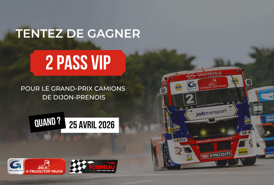 ✨ À gagner : 2 Pass VIP pour le Grand Prix Camions de Dijon, comprenant l’accès aux courses du samedi ainsi que l’accès à l’espace VIP de la Team Robineau.